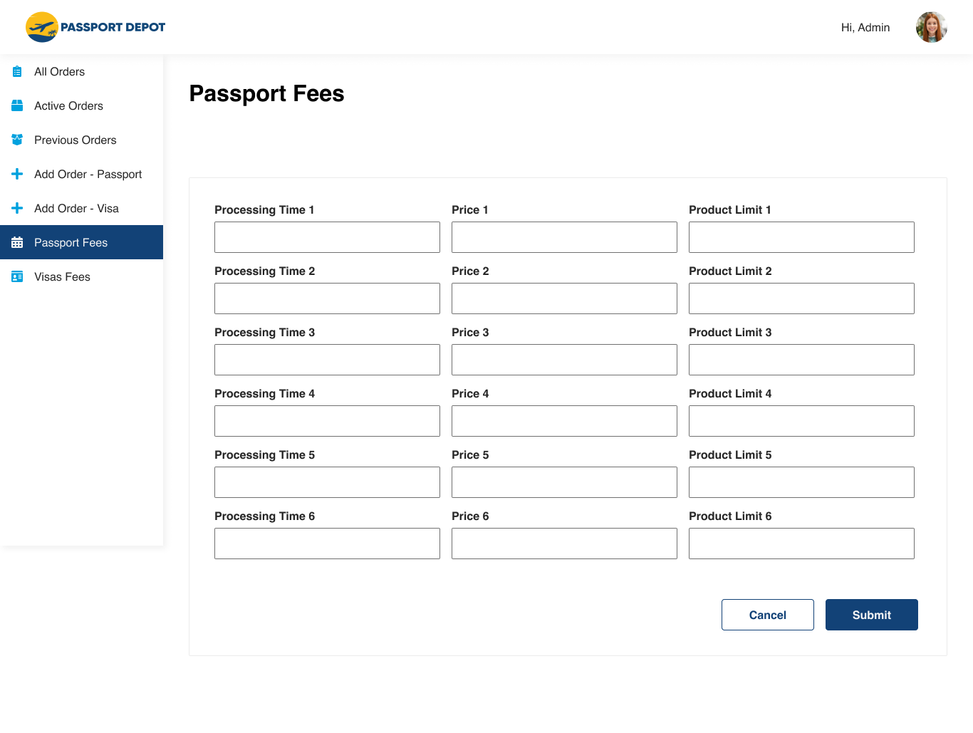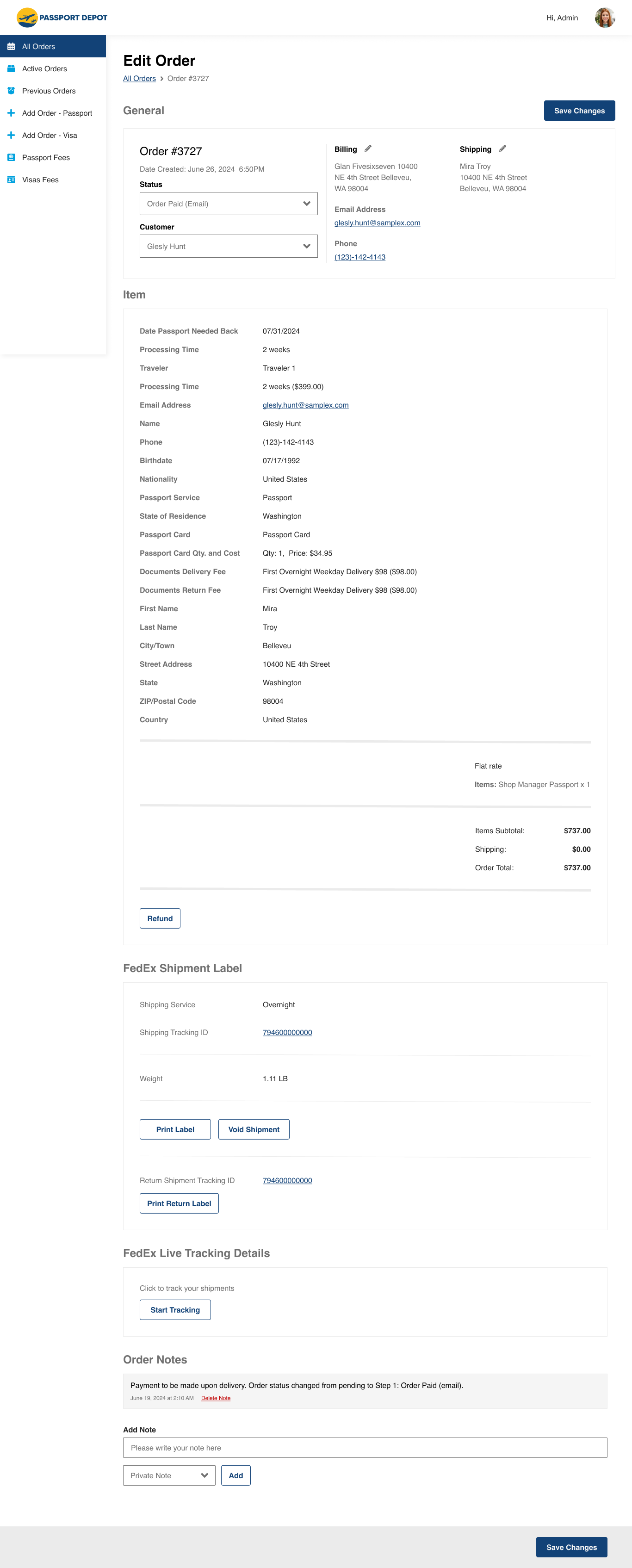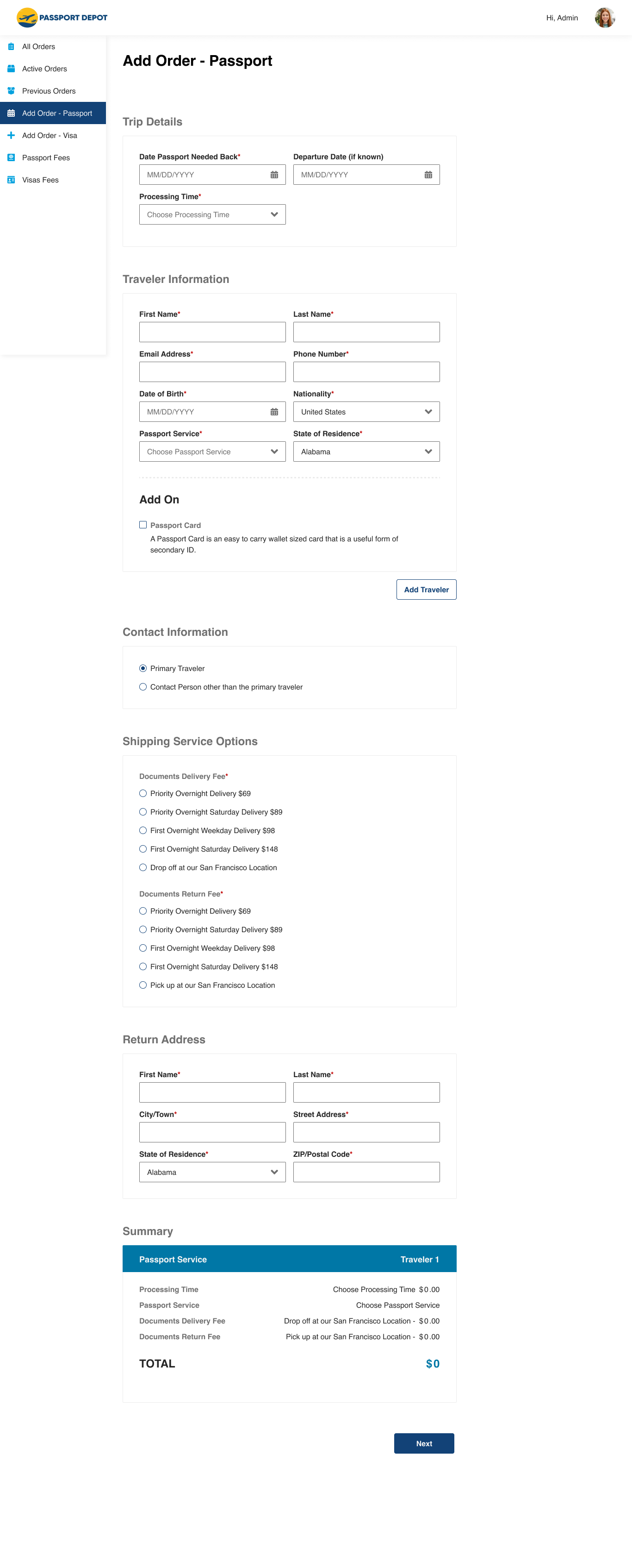 - Create an admin interface where the Passport Depot admin can view and create orders, and manage their services.